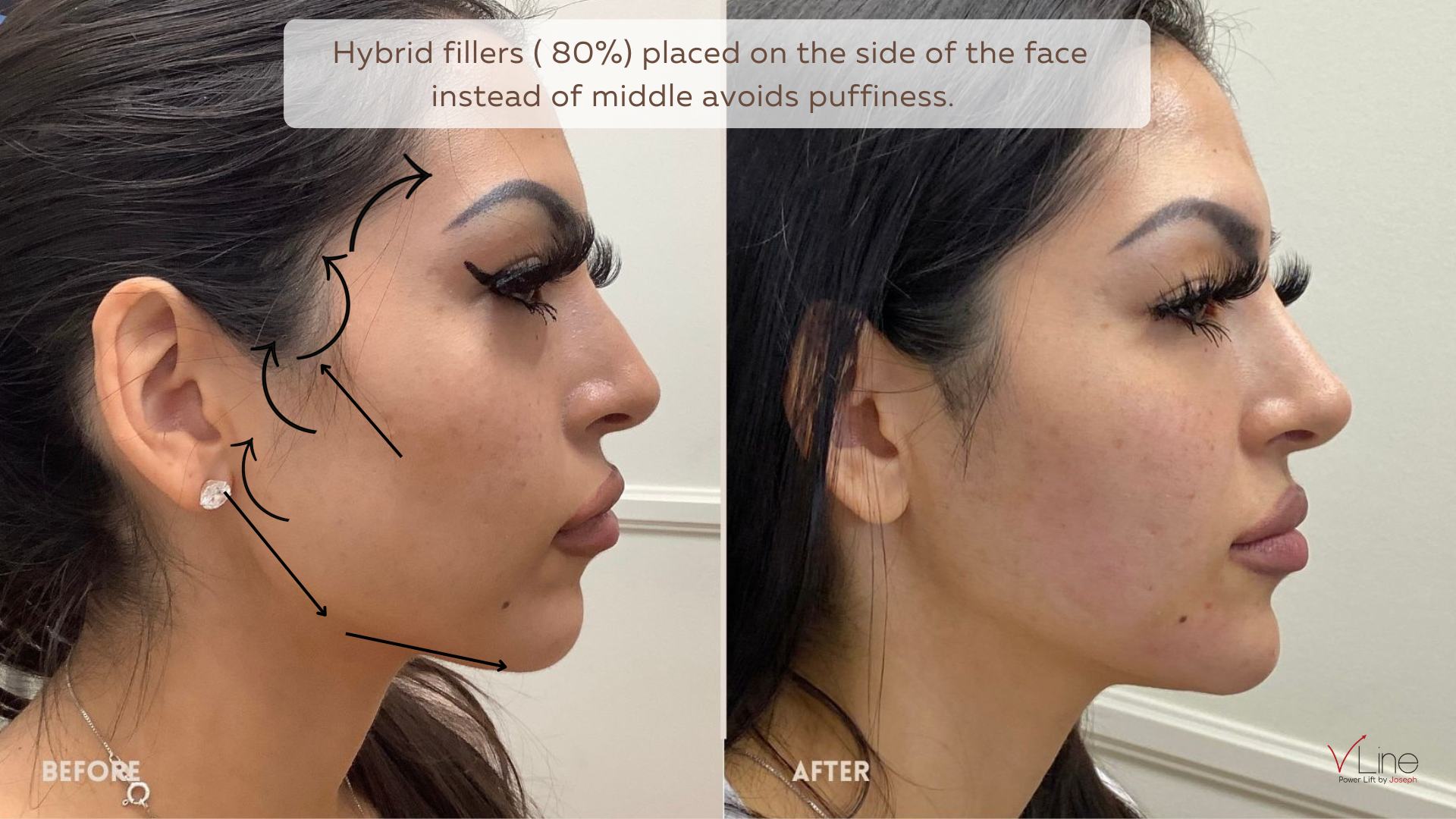 The V-Lift technique focuses on placing fillers or biostimulators along the sides of the face rather than the center — helping to lift and contour the face naturally without adding bulk to the middle.