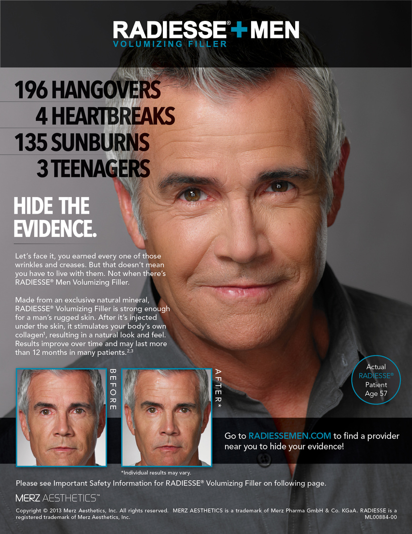Radiesse is a facial filler that works perfectly as a treatment for men to further treat fine lines and wrinkles. This injectable filler replenishes lost volume in your face and can stimulate the production of your own natural collagen. Most men as they age, experience their skin losing the natural support structures (collagen and elastin). This loss shows as the face loses the supple skin and youthful appearance. As time passes, as the youthful look of your skin diminishes, without treatment aging skin loses its ability to bounce back. Wrinkles, creases and fine lines become the unfortunate result.
